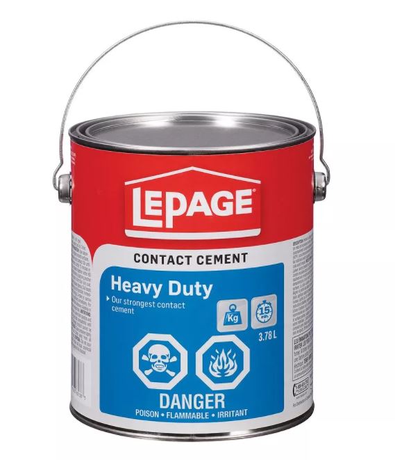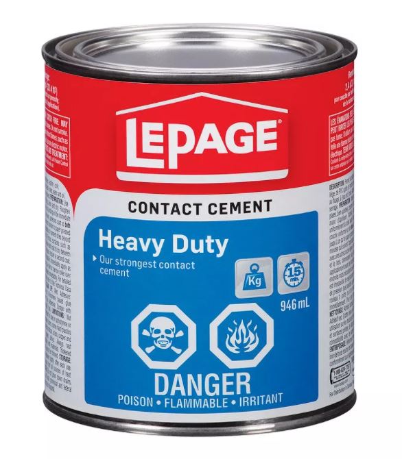 LePage® Heavy Duty Contact Cement is a premium grade solvent-based adhesive that offers a high strength bond resistant to heat, creep, water and oil.